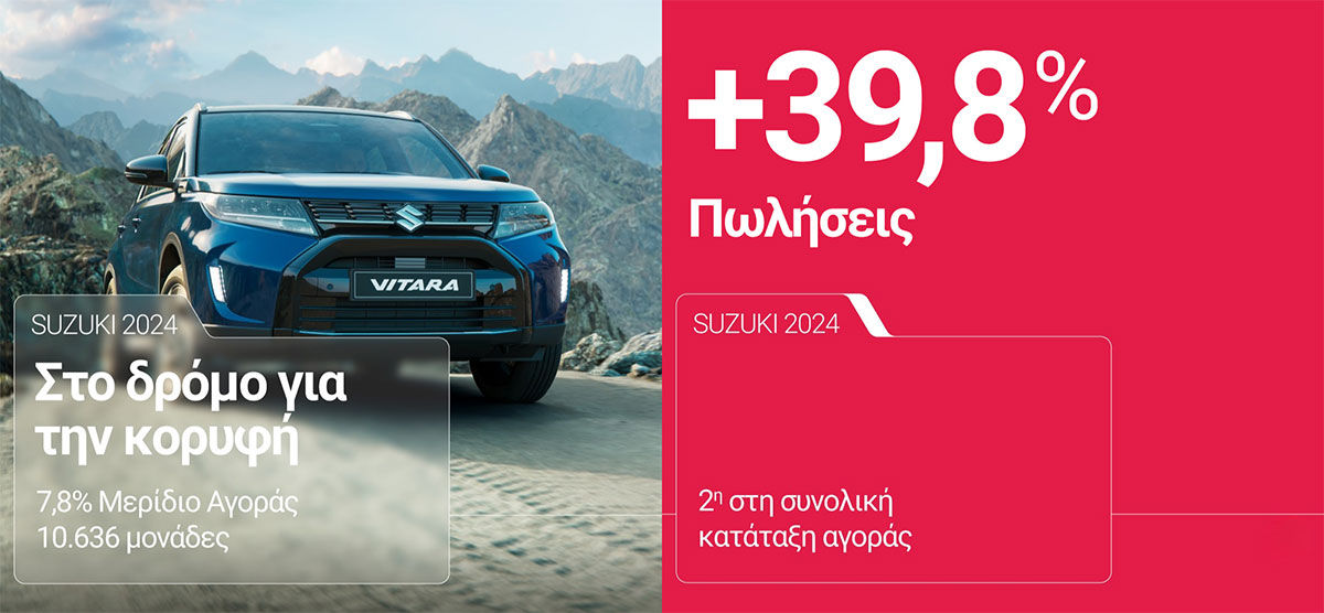 Το 2024 ήταν μία χρονιά-ορόσημο για τη Suzuki, η οποία σημείωσε εκπληκτικές επιδόσεις με κορυφαία υβριδικά αυτοκίνητα και κατέκτησε την εμπιστοσύνη ακόμη περισσότερων Ελλήνων οδηγών. Σε μια αγορά που παρουσίασε συνολική αύξηση 1,9% (137.101 ταξινομήσεις επιβατικών οχημάτων), η Suzuki ξεχώρισε με αύξηση πωλήσεων 39,7%, φτάνοντας τις 3.025 νέες ταξινομήσεις και ανεβάζοντας το συνολικό της απολογισμό στις 10.636 μονάδες. Με το μερίδιο αγοράς να εκτινάσσεται από το 5,7% στο 7,8%, η Suzuki δικαίως κατακτά κορυφαία θέση στην ελληνική αυτοκινητοβιομηχανία.
